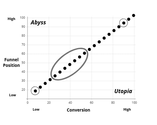 With an understanding of the chart above, we can now start to discuss the dynamic of the well-optimized line as it relates to specific channels and tactics. This will let you understand where your marketing efforts fall along this line and what can be done to move away from the abyss and closer to Utopia.