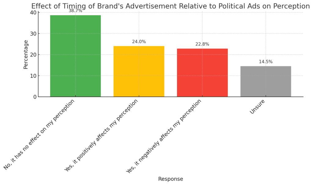 Age: Younger respondents (18-29) are more evenly split in their perceptions compared to older respondents who tend to have clearer opinions. Older age groups (45+) are less influenced by the timing of ads relative to political ads.