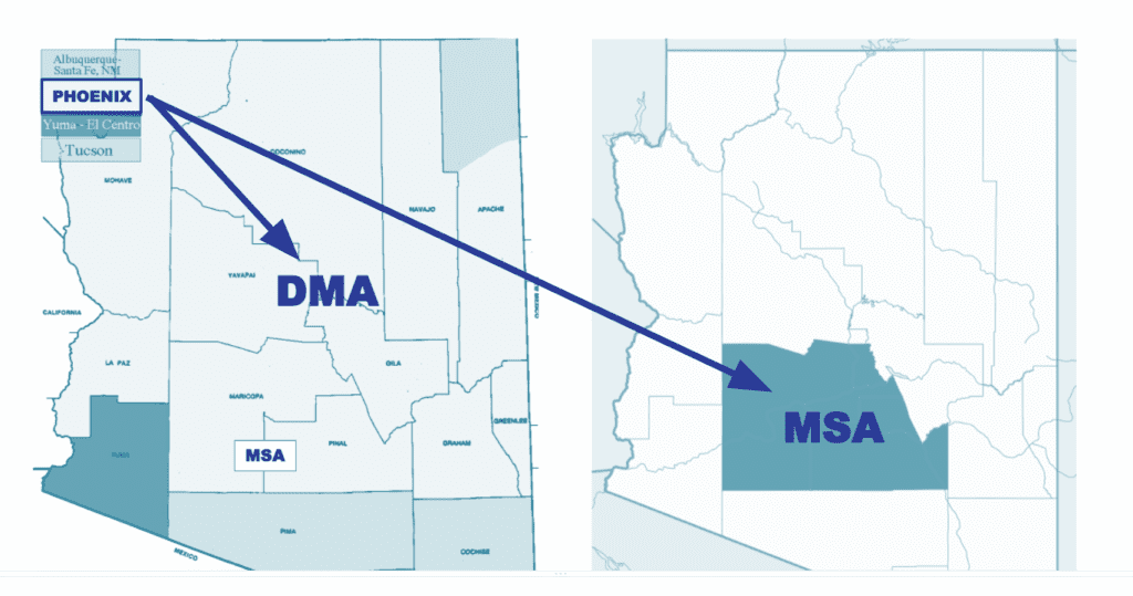 DMA vs. MSA – DMA is a Nielsen TV measurement term for Designated Market Area and refers to where TV signals can reach to determine the area for each market. MSA is a Nielsen Audio Measurement term for Metropolitan Statistical Area and refers to how far radio signals reach in defined broadcast markets.